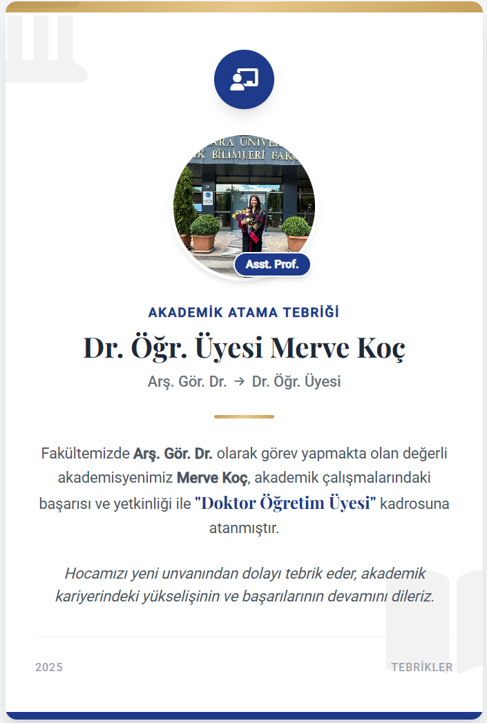 Dr. Öğr. Üyesi Merve KOÇ'u tebrik eder, akademik çalışmalarında başarılarının devamını dileriz.